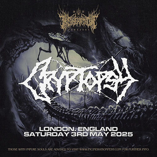 PIONEERS OF TECHNICAL DEATH METAL – CRYPTOPSY RETURN TO LONDON.Tech death legends Cryptopsy will make a debut appearance at Incineration Festival in 2025, wielding the hammer of brutal death metal on the Electric Ballroom stage alongside Decapitated, Blackbraid, Spectral Wound, Warbringer and Conjurer.